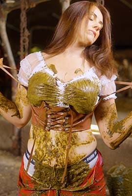 After Lyndra had her first experience with pigshit in the large lagoon she wanted more of it. Luckily she found a new location to have a lot more fun. She sees some pigs and walks right over to the pig pen, where the floor is completely covered in pig shit. First she’s a bit disgusted by the smell and the big turds the pigs left there. It’s quite different from her previous experience in the manure lagoon. She kneels down into the creamy pile of pigshit and begins to cover her boobs with it. She smears her body very sensually while the pigs next to her are also interested in what she’s doing there. After Lyndra covers her dress, breasts, legs and arms, she smears some pig shit on her panty and begins to use her vibrator on her already swollen clit. She moans softly as she takes in the whole sensation of being covered in pig shit. She enjoys herself in different positions before sitting back down in the creamy shit and continues to masturbate. As she has covered her complete Dirndl, she takes it off and begins to smear more and more pig shit on her bare skin. She’s enjoying it more and more, the very strong smell of the pig shit and all that comes with it. Lyndra completely covered in pigshit allows herself now to climax, because she’s right outside she can’t be heard, so she takes a handful of cowshit and pushes it against her mouth so she can muffle her screams while she has an amazing orgasm. Before she gets dressed again she stuffs some shit in her panty, to have something for later.