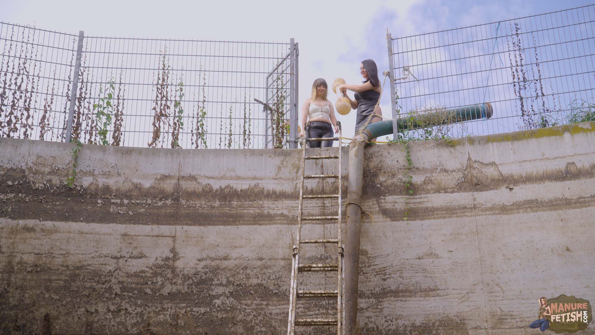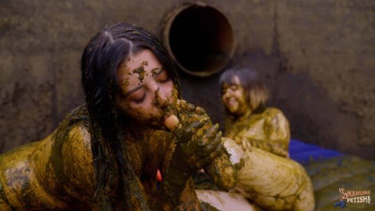 Rada Brewer and Lyndra Lynn are at a party near the cowshed, they take a break from the party and wander around, then they see some floatable toys near the large manure pit. They decide to have some fun, so they grab the toys and climb down the ladder. Down in the pit, they both climb on their inflatable wooden log and begin their first fight. Rada deals some good hits and Lyndra loses the balance and falls down into the creamy cow dung. Rada laughs at Lyndra and in an instant Lyndra takes revenge and pushes Rada down in the cow dung. Now both girls are covered in the creamy stinky mess. As soon as both realize what happens horniness overcomes them. Both begin to kiss first, then they go over to the ladder, where Rada climbs up and Lyndra begins to lick her asshole. Then both go over to the floating mattress and begin to lick each other’s pussies. In between they go for a little swim in the large Manure Pit before continuing to fuck each other with toys and their fingers. Both have a lot of fun in the large pit with the huge amount of cow dung. They fuck each other in different positions till the end, where both have a nice orgasm and decide that’s enough and both climb out.