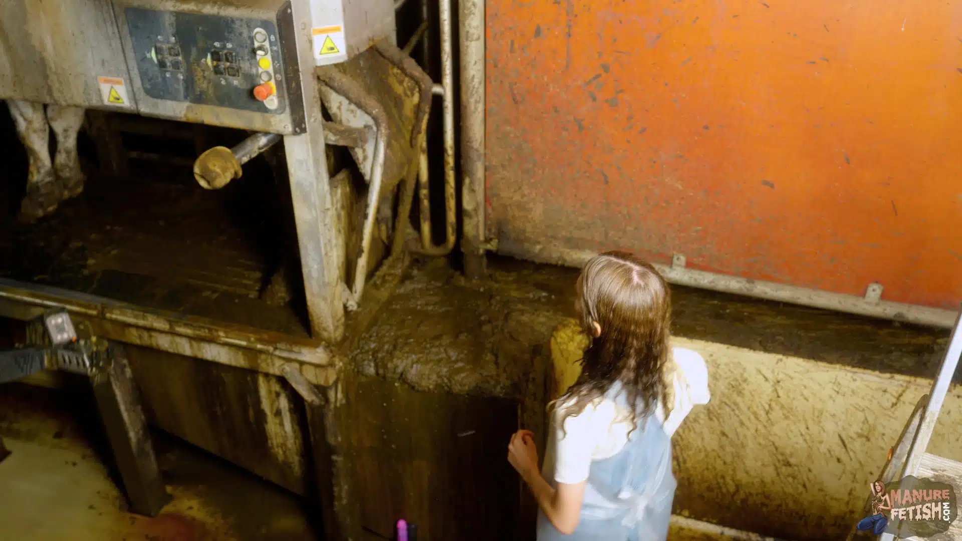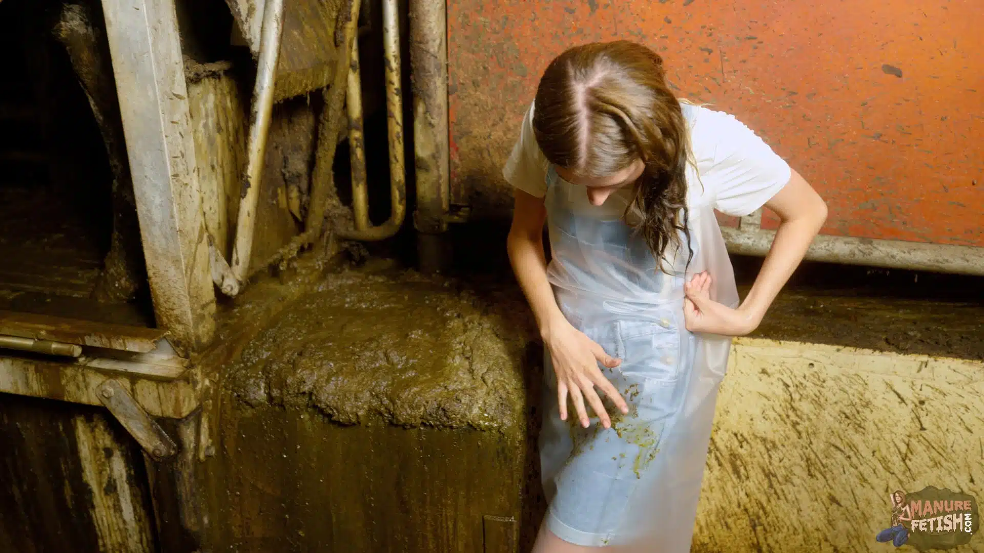 The work day on the farm comes to an end, Maria Anjel makes her rounds to check if everything is in order in the Milking room with the automatic Milking machine. The Manure tray where all the cowshit is landing during the milking is nearly overflowing. Anjel is intrigued by it and always loved the smell of cowshit. So she begins to smear some of the cowshit on her apron. Being filthy is really her thing, so she covers her apron even more. Then she takes it off and puts it on top of the cowshit. Anjel pushes her face right into the creamy shit and smears a good handful on her head. Now she’s really horny and sits on the edge masturbating her pussy through her jeans jumpsuit and covering every part of it with cowshit. That’s not enough for her, she wants more, so she climbs into the manure tray, it overflows instantly making a complete mess in the milking room.